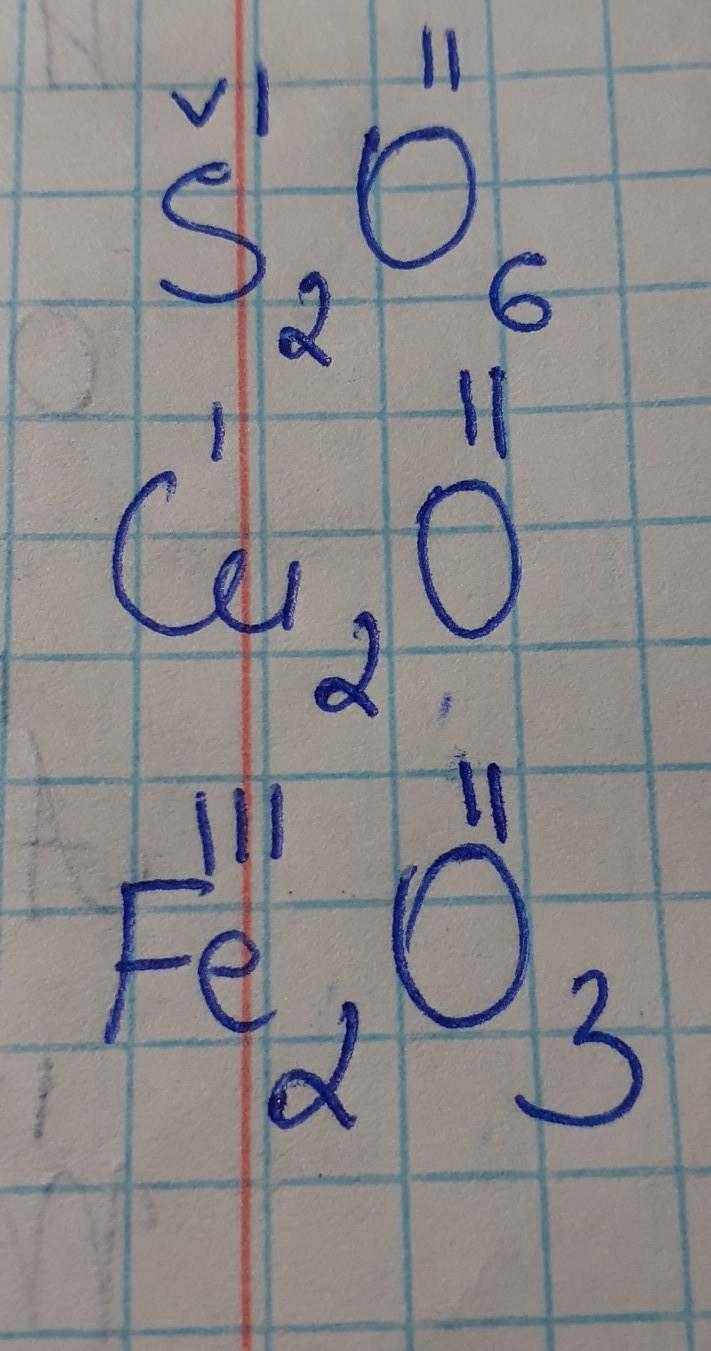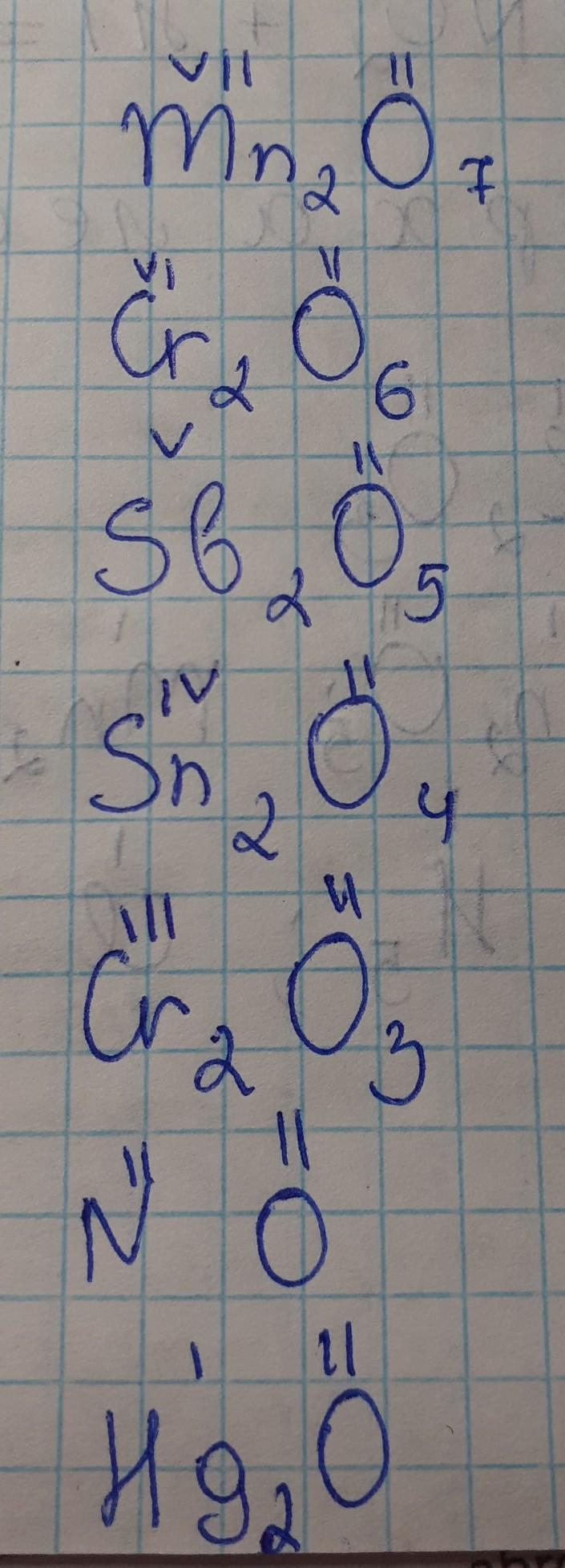 Скласти формули складних речовинб утворених Оксигеном і такими елементами: Mn(VII), Cr(VI), Sb(V), Sn(IV), Cr(III), N(II), Hg(I), S(VI), Cu(I), Fe(III)