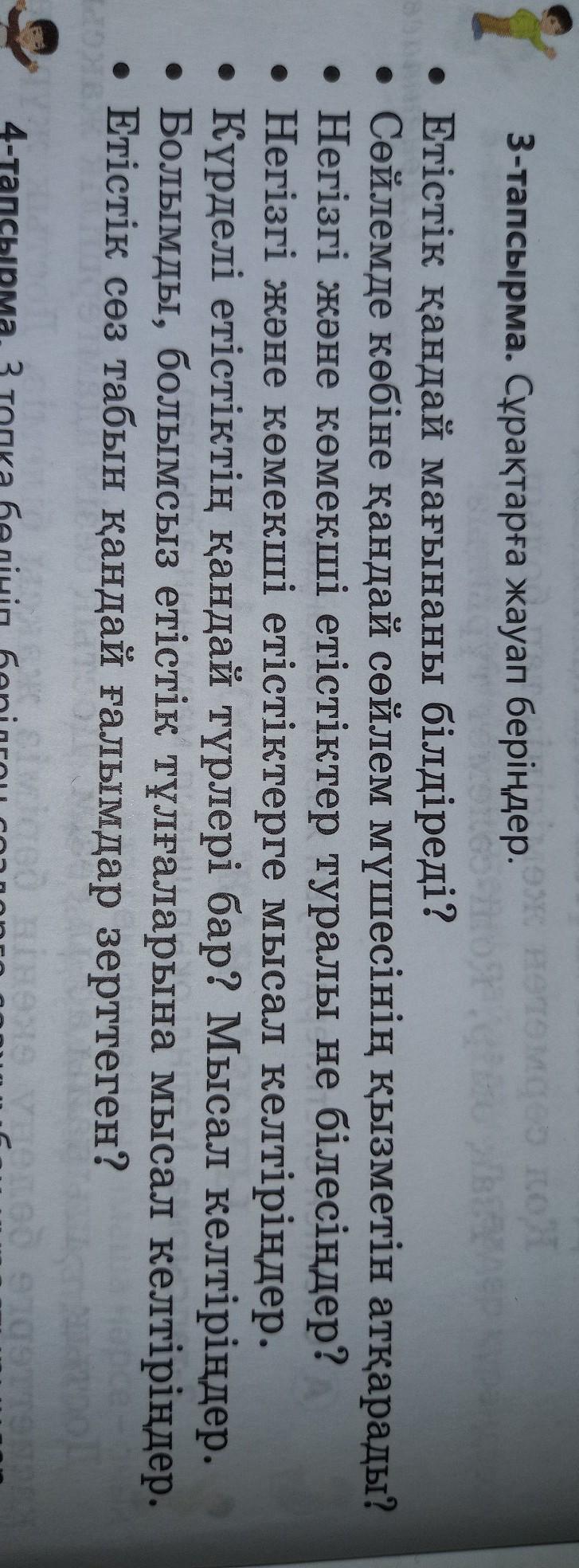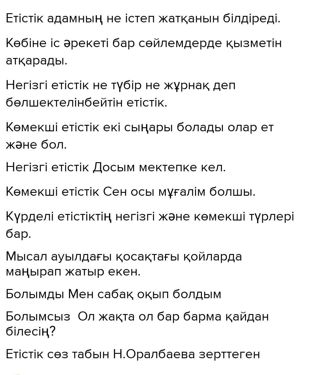 ⚠️❗⚠️❗⚠️❗⚠️❗⚠️❗⚠️❗⚠️❗⚠️❗⚠️❗⚠️❗⚠️❗⚠️❗⚠️❗⚠️❗⚠️❗⚠️⚠️❗⚠️3-тапсырма. Сұрақтарға жауап беріңдер. • Етістік қандай мағынаны білдіреді? • Сөйлемде көбіне қандай сөйлем мүшесінің қызметін атқарады? • Негізгі және көмекші етістіктер туралы не білесіңдер? • Негізгі және көмекші етістіктерге мысал келтіріңдер. Күрделі етістіктің қандай түрлері бар? Мысал келтіріңдер. • Болымды, болымсыз етістік тұлғаларына мысал келтіріңдер. Етістік сөз табын қандай ғалымдар зерттеген?