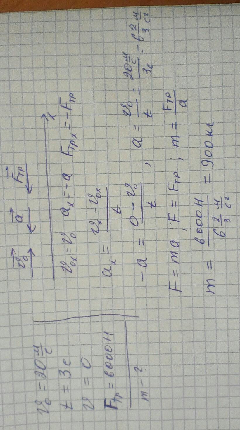 Автомобиль , первоначально двигавшийся со скоростью 20 м/с , после выключения двигателя остоновился через 3 секунды. Сила соплотевления , действовавшая на автомобиль при торможении равна 6000 Н масса автомобиля... 1) 600 кг 2) 700 кг 3) 800 кг 4) 900 кг 5) 1000 кг