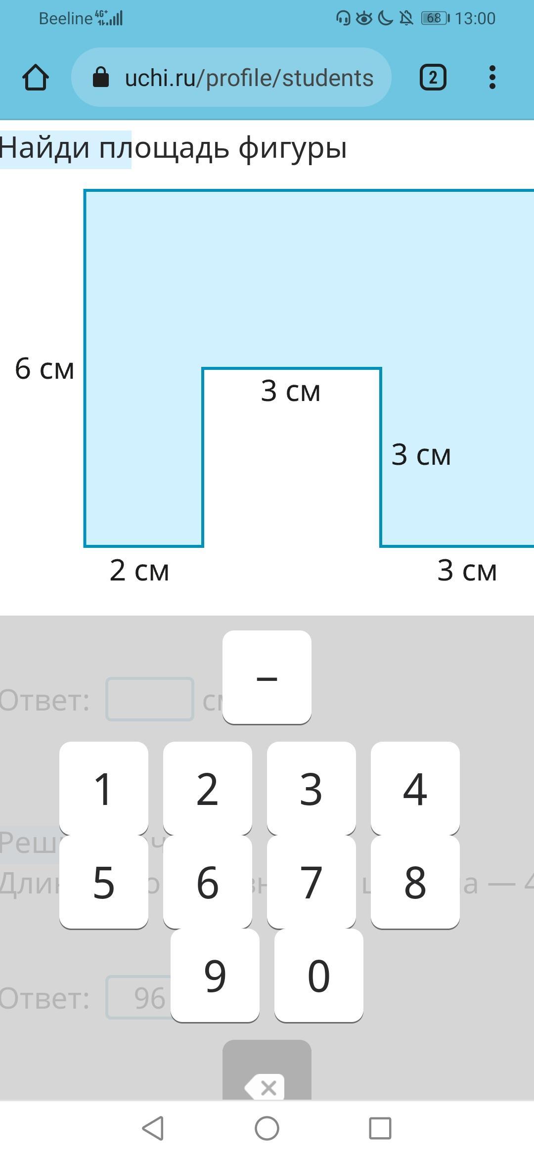 площадь прямоугольника:6×(2+3+3)=48.площадь вырезанного квадрата:3×3=9. искомая площадь:48-9=39