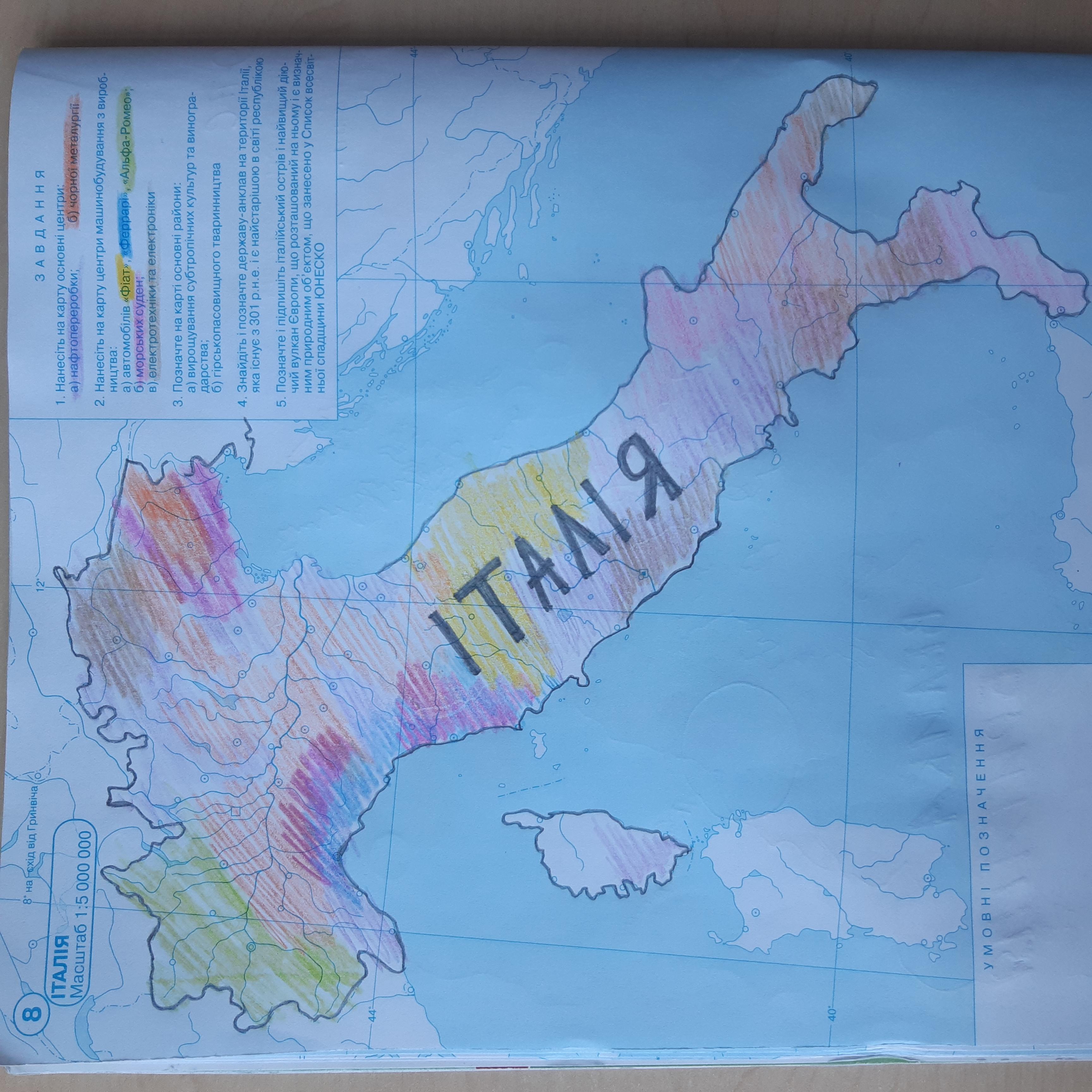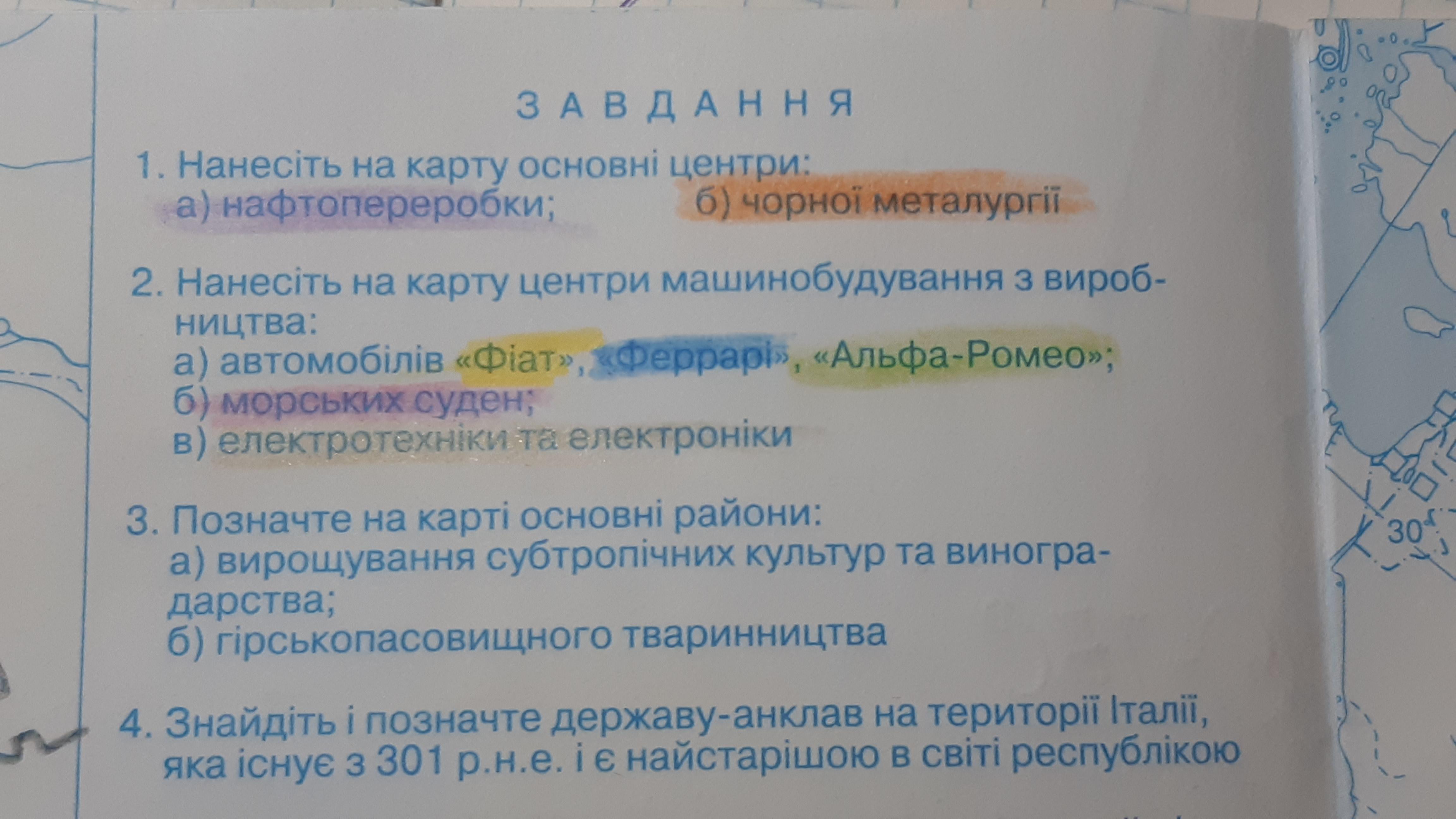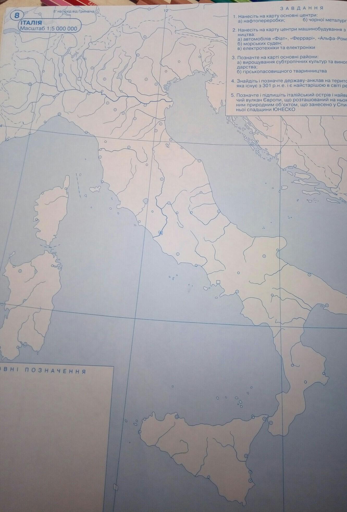 2. Нанесіть на карту центри машинобудування з виробництва: а) автомобілів фат» феррар. "Альфа-Ромео : б) морських суден: в) електротехніки та електроніки