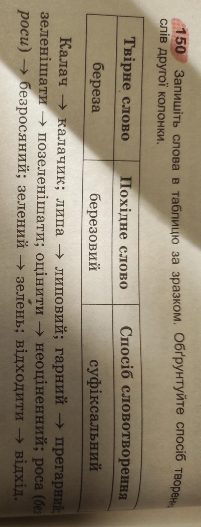 150 Запишіть слова в таблицю за зразком. Обгрунтуйте спосіб творення слів другої колонки. Твірне слово Похідне слово Спосіб словотворення береза березовий суфіксальний (Калач - калачик; липа - липовий; гарний прегарний; зеленішати - позеленішати; оцінити - неоціненний; роса (без роси) безросяний; зелений - зелень; відходити відхід.). ПОЖАЛУЙСТА ПОМОГИТЕ СРОЧНО