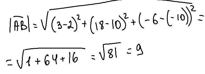 Вычисли длину вектора AB−→−, если даны точки A(2;10;−10) и B(3;18;−6).