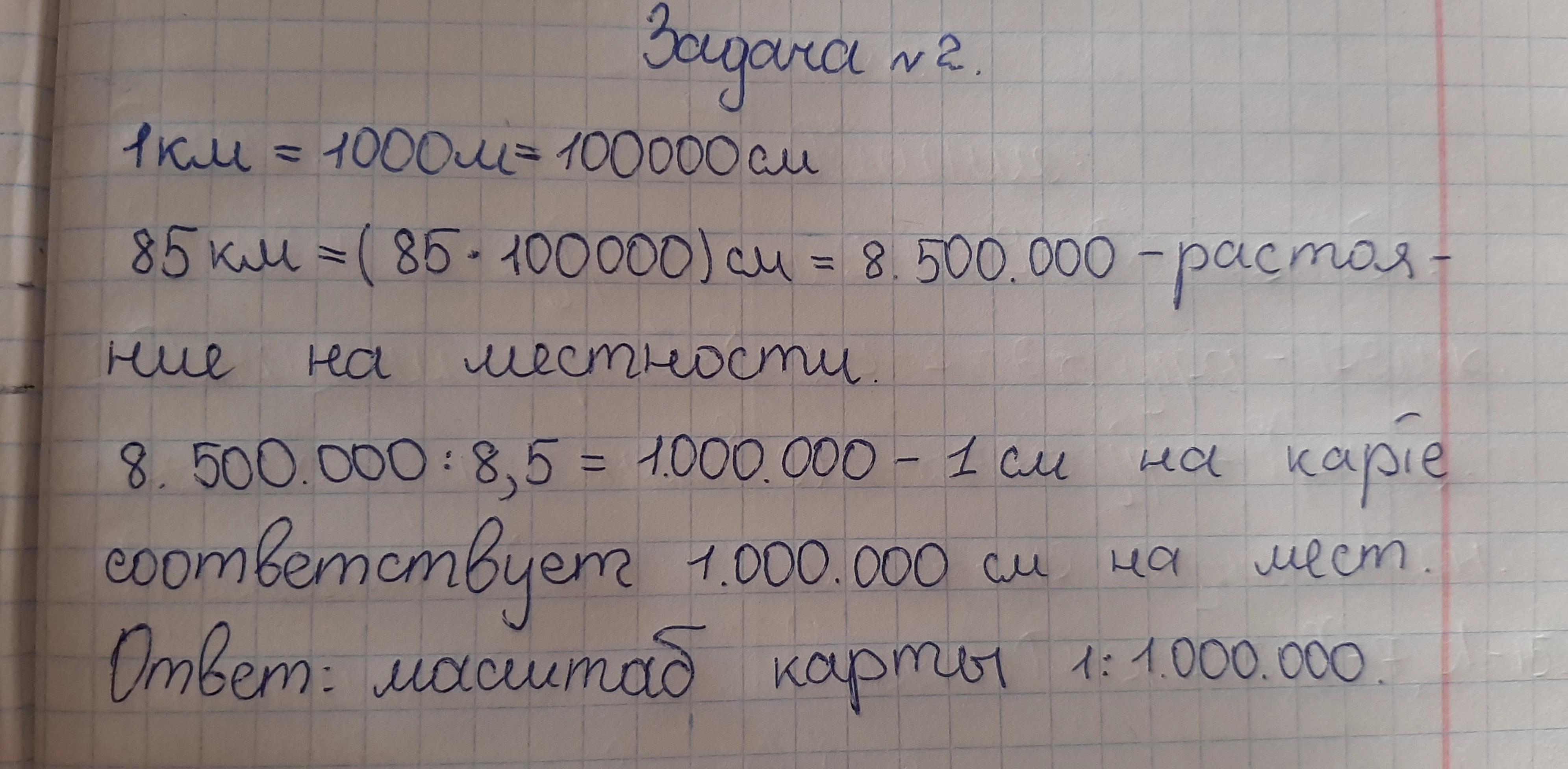Определите масштаб карты, если на ней расстояние между Донецком и Мариуполем 8,5 см, а на местности - 85 км.