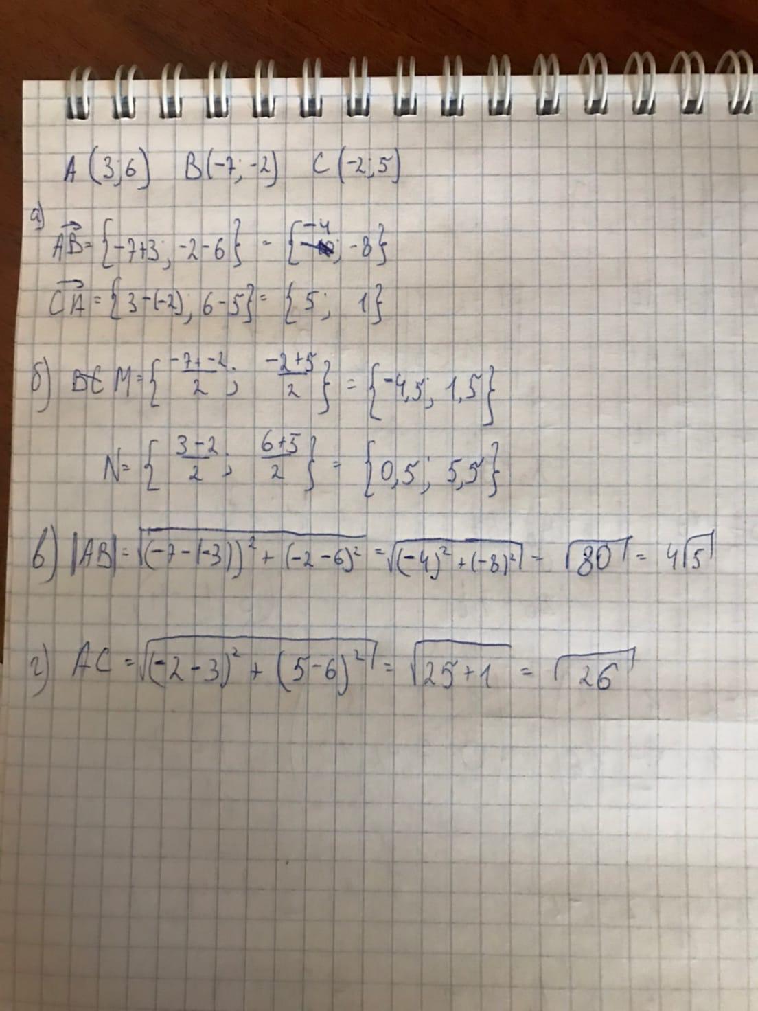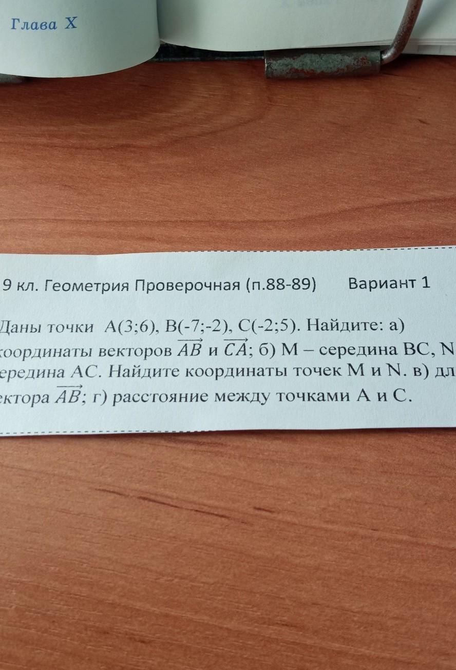 и Даны точки А(3;6), B(-7;-2), C(-2;5). Найдите: а) координаты векторов AB и CA; б) M – середина BC, N — середина АС. Найдите координаты точек Ми N. в) длину вектора AB; г) расстояние между точками АиС. СРОЧНО