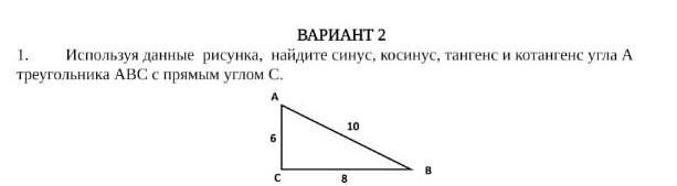 Используя данные рисунка, найдите синус, косинус, тангенс и котангенс угла А треугольника АВС с прямым углом С.