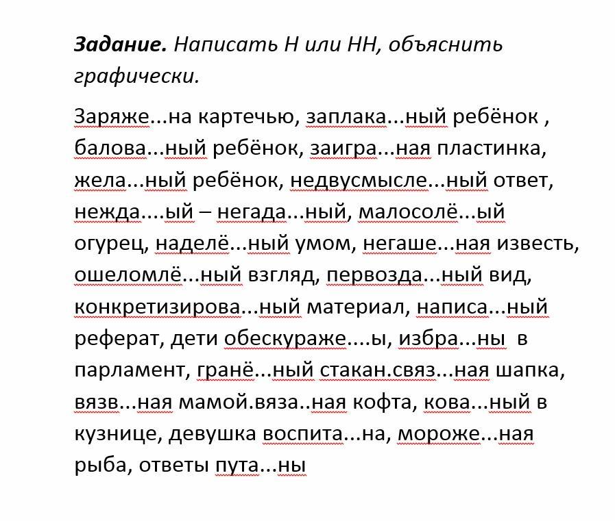 ЗаряжеНа картечью, заплакаННый ребёнок, баловаННый ребёнок, заиграННая пластинка, желаННый ребёнок, недвумыслеННый ответ, неждаННый-негадаННый, малосолёНый огурец, наделёННый умом, негашеНая известь, ошеломлёННый взгляд, первоздаННый вид, конкретизироваННый материал, написаННый реферат, дети обескуражеННы, избраННы в парламент, гранёНый стакан, связаННая шапка, вязаННая мамой, вязаННая кофта, коваНый в кузнице, девушка воспитаНа, морожеНая рыба, ответы путаНы.