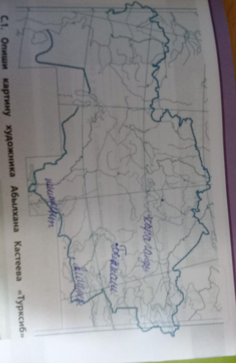 В.2. Используя карту в учебнике (с. 9), на контурной карте в тетради - обозначь кружками и подпиши города: Караганды, Шымкент, Балкаш; обозначь город, в котором была основана кондитерская — обозначь пунктирной линией Туркестано-Сибирскую » фабрика «Рахат»; желез- ную дорогу (Турксиб). 20