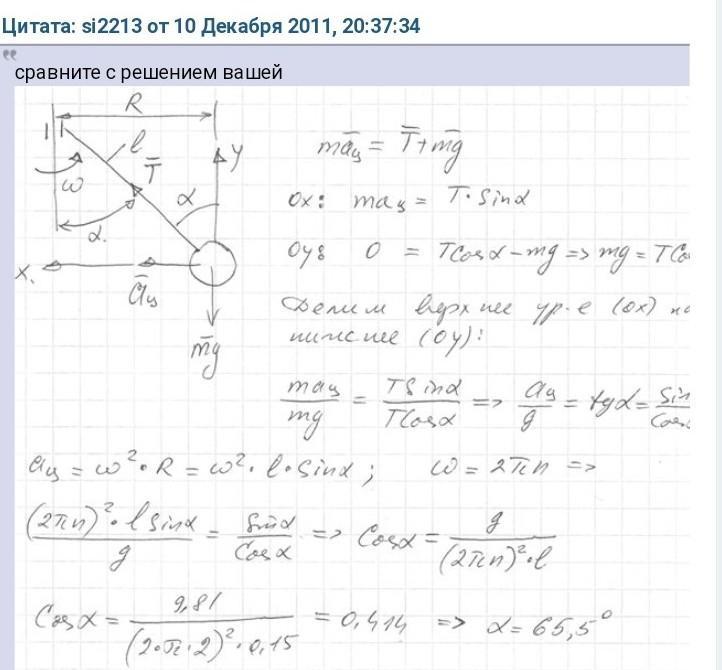 Модель центробежного регулятора (смотрите рисунок) вращается с частотой п=2 с-1. Учитывая только массу шаров, определите угол отклонения стержней, несущих шары. Длина стержней l=15 см