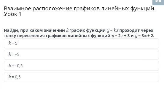 Найди, при каком значении k график функции y = kx проходит через точку пересечения графиков линейных функций y = 2x + 3 и y = 3x + 2.