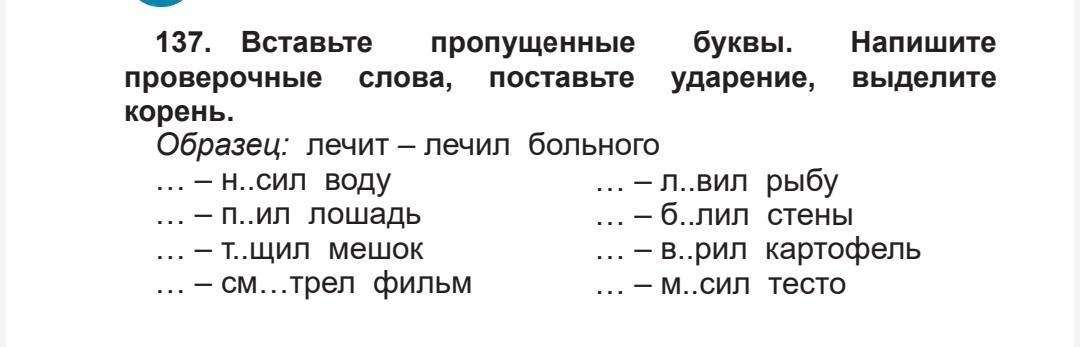 .но́сит–носи́л воду2.по́ит–пои́л лошадь 3. та́щит–тащи́л мешок 4.смотре́ть- смотрел фильм 5.ло́вит- лови́л рыбу 6.бе́оит- бели́л стены 7.ва́рит - вари́л картофель