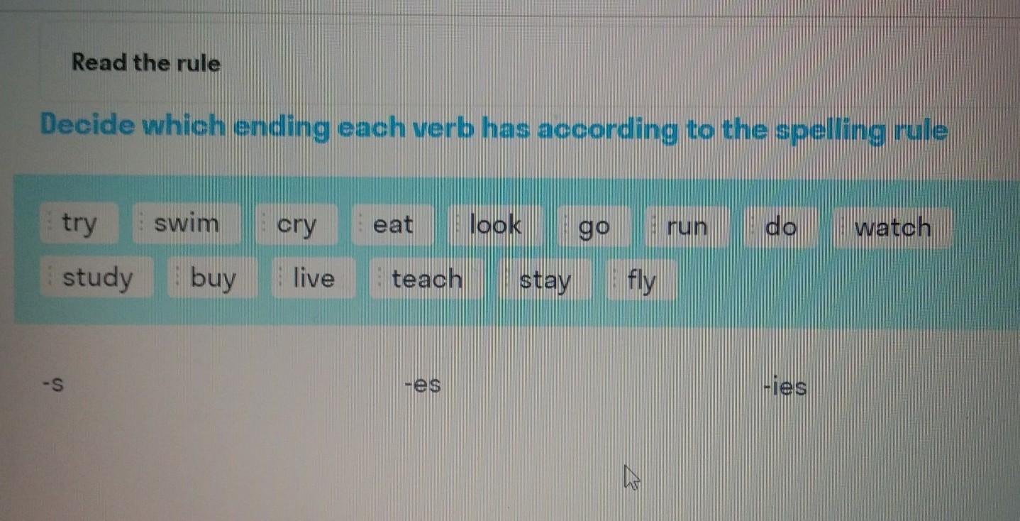 Ответ: Tries,swims,cries,eats,looks,goes,runs,does,watches,studies,buys,lives,teaches,stays,flies.