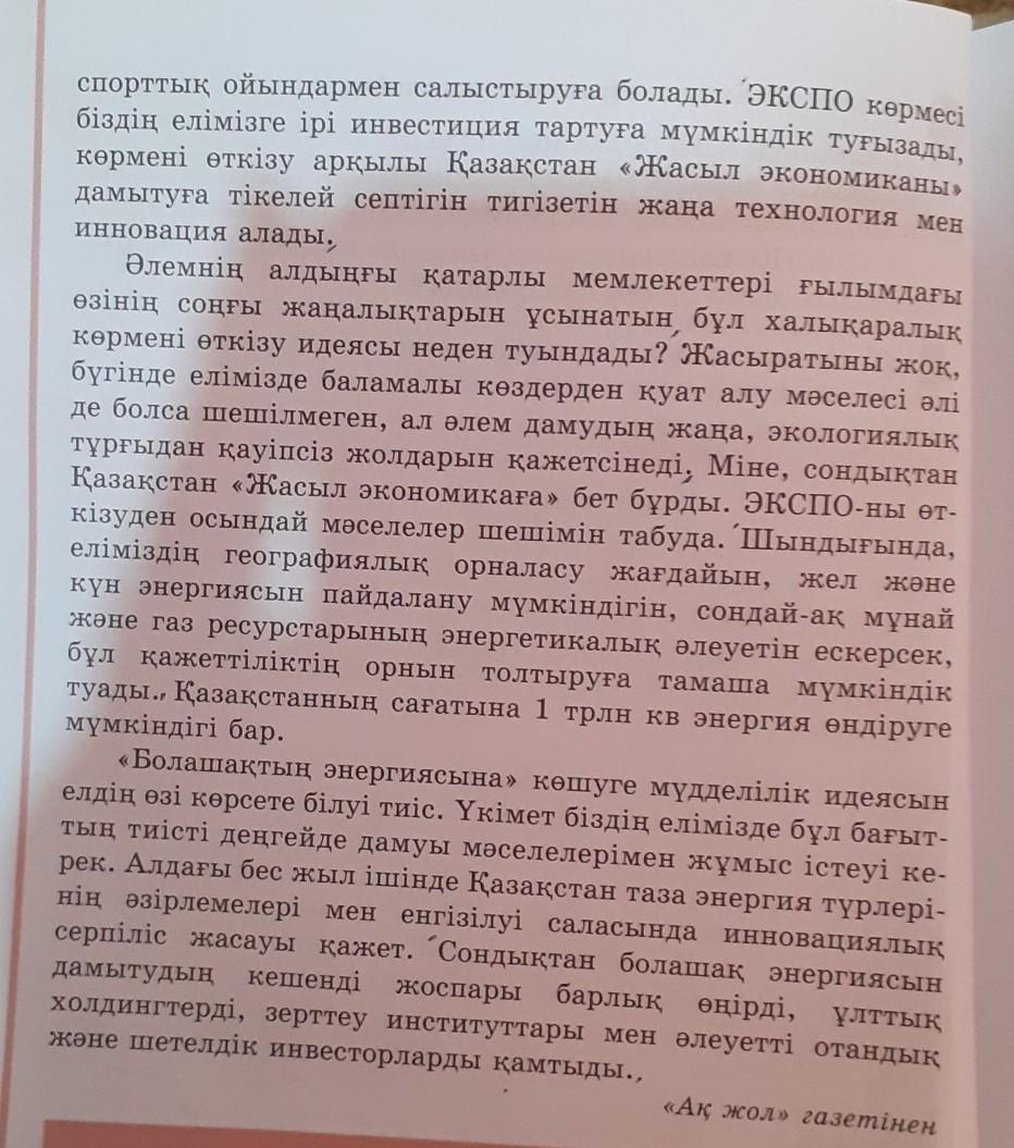 5. Мәтіндегі тірек сөздерді анықтап, аннотация жаз. Аннотация жазуға қойылатын талаптар: - мазмұнды қысқаша баяндау; - көпшілікке арналып, түсінікті жазылу; - мәтінде айтылған ақпараттың ерекшелігін айту; - автордың осы басылымды жазудағы басты мақсатын айқындау; аннотация жазылып отырған мәтінге баға беру.