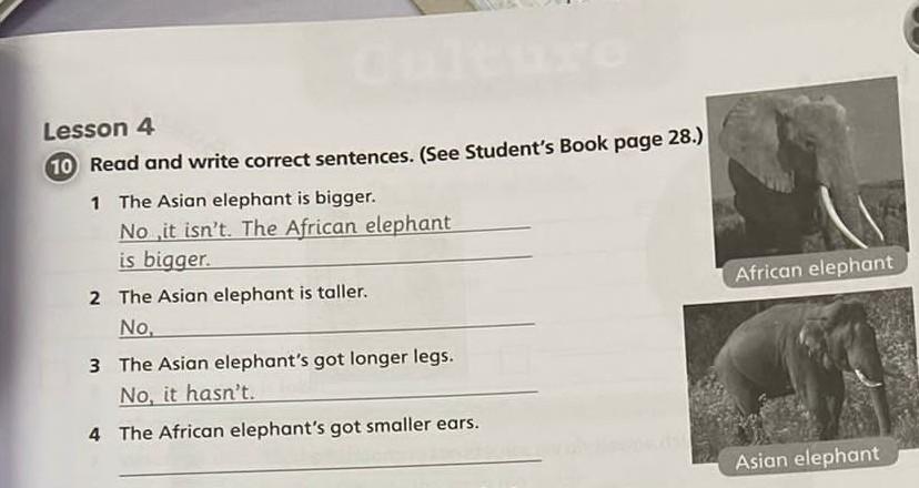 Ответ: 2) no, it isn't. The African elehpant is taller. 3) no, it hasn't. The African elephant's got longer legs. 4) no, it hasn't. The Asian elephant's got smaller ears