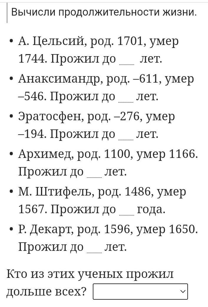 Цельсий- 43, Анаксимандр- 65, Эратосфен- 82, Архимед- 66, Штифель- 81, Декарт- 54. Дольше всех- Эратосфен.