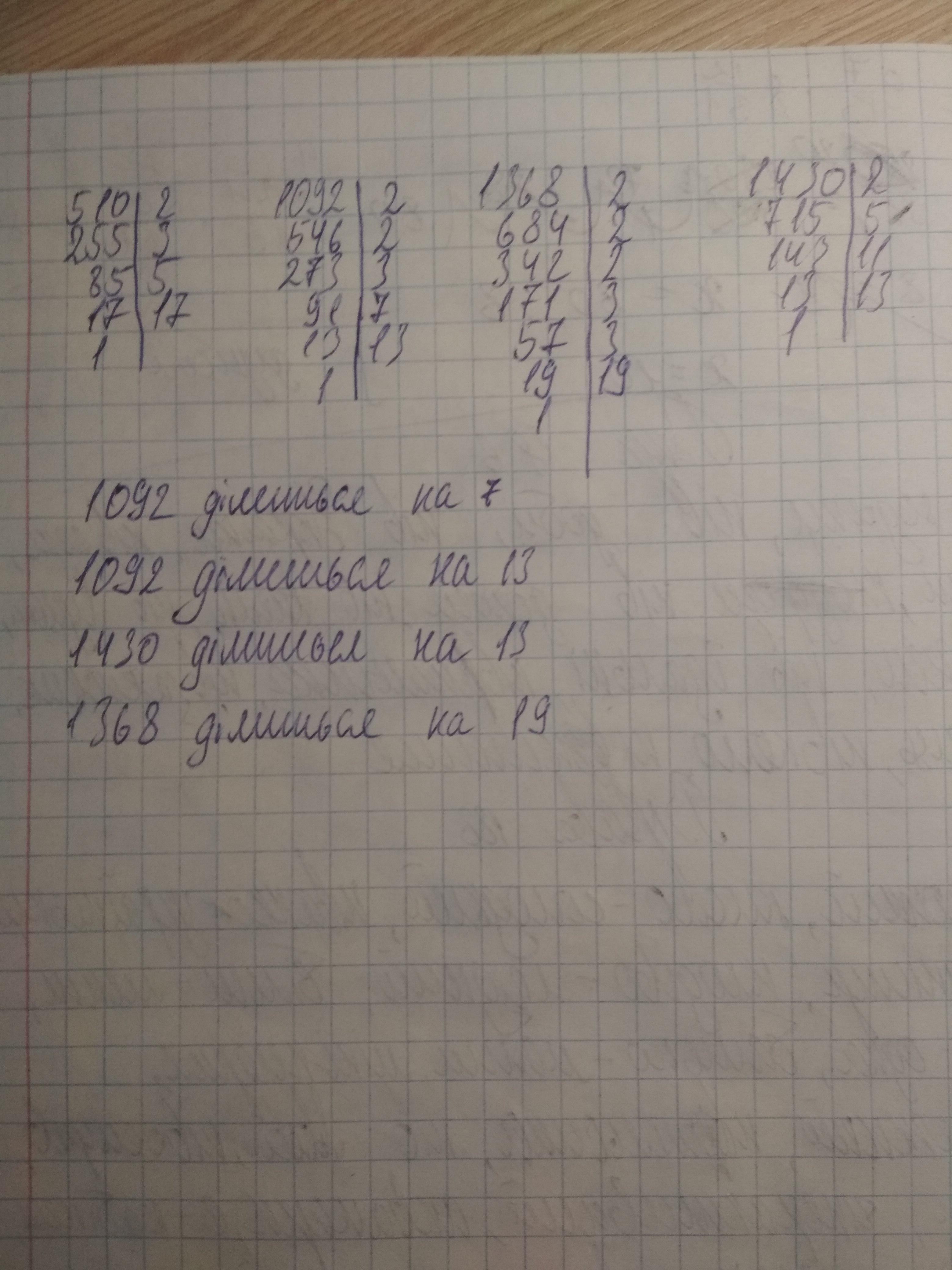 Из них на 7 делится число 1092, на 13 делятся числа 1092 и 1430, а на 19 делится число 1368