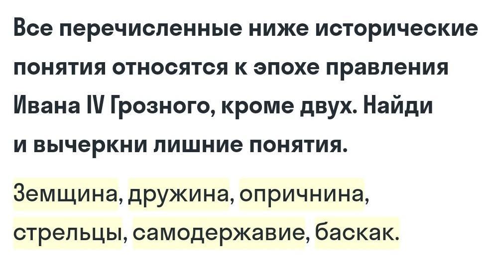 лишние : стрельцы , самодержание , баскак вроде так может быть неправильно..