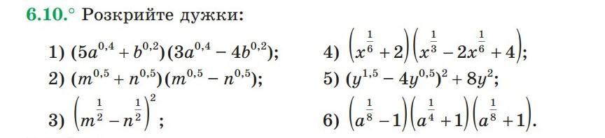 (5a^{0,4}+b^{0,2})(3a^{0,4}-4b^{0,2})=15a^{0,8}-17a^{0,4}\, b^{0,2}-4b^{0,4}\\\\\\(m^{0,5}+n^{0,5})(m^{0,5}-n^{0,5})=m-\\\\\Big(m^{\frac{1}{2}}-n^{\frac{1}{2}}\Big)^2=m-2m^{\frac{1}{2}}\, n^{\frac{1}{2}}+n\\\\\Big(x^{\frac{1}{6}}+2\Big)\Big(x^{\frac{1}{3}}-2x^{\frac{1}{6}}+4\Big)=x^{\frac{1}{2}}+8\\\\\Big(y^{1,5}-4y^{0,5}\Big)^2+8y^2=y^3-8y^2+16y+8y^2=y^3+16y