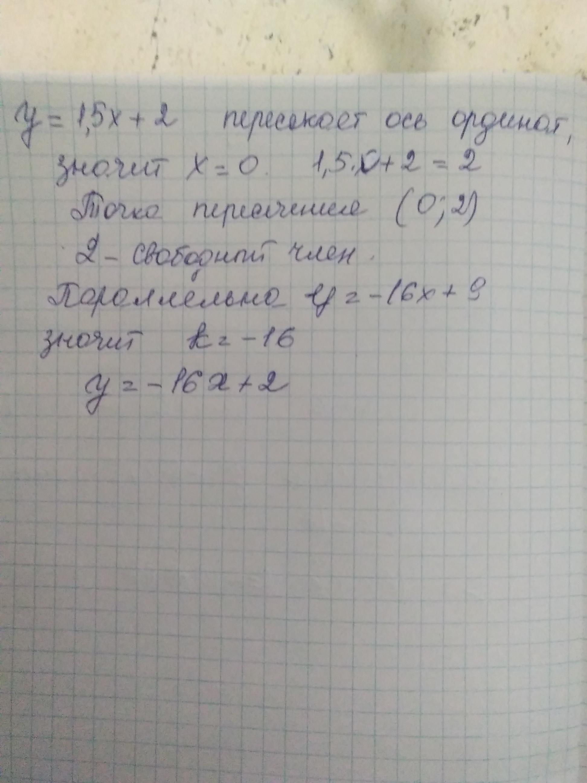 Напиши формулу, задающую линейную функцию y = kx + b, график которой параллелен графику функции y = –16x + 9 и пересекается с графиком функции y = 1,5x + 2 на оси ординат. помогите пожалуйста!