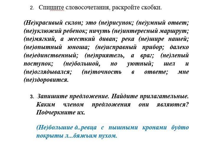 Некрасивый склон; это не рисунок; неумный ответ; неуклюжий ребенок; ничуть неинтересный маршрут; не мягкий, а жесткий диван; река не шире нашей; неопытный юноша; неисправный прибор; далеко не единственный; не приятнль, а враг; нелепый поступок; небольшой, но уютный; шел и не оглядывался; неточность в ответе; мне нездоровится.