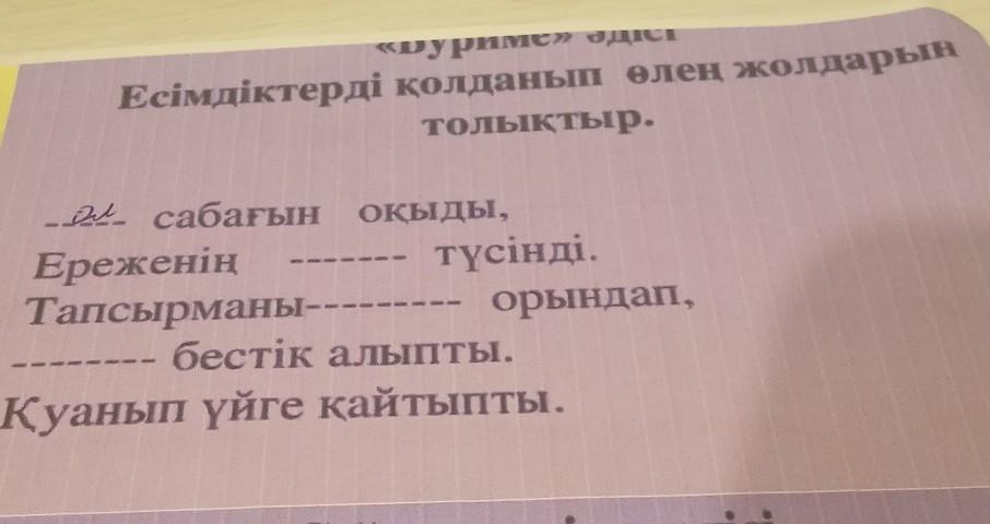 «Dypимe» одист Есімдіктерді қолданып өлең жолдарын толықтыр. ... сабағын оқыды, Ереженің ... түсінді. Тапсырманы... орындап, ... бестік алыпты. Қуанып үйге қайтыпты. ПАЖАЛУЙСТА ПОМАГИТЕ СРОЧНО