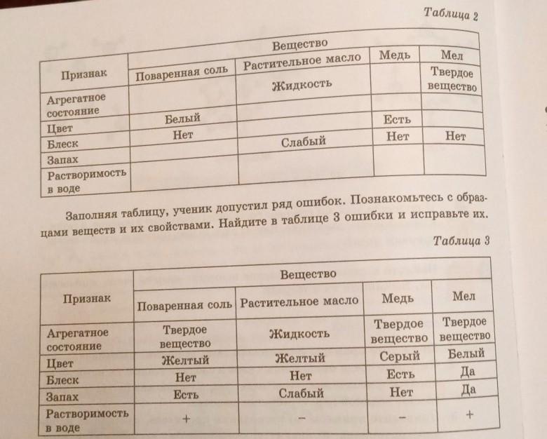 Таблица 2 Вещество Растительное масло Медь Признак Поваренная соль Мел Твердое вещество Жидкость Белый Нет Есть Нет Агрегатное состояние Цвет Блеск Запах Растворимость в воде Слабый Нет