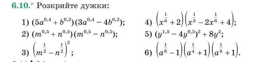 (5a^{0,4}+b^{0,2})(3a^{0,4}-4b^{0,2})=15a^{0,8}-17a^{0,4}\, b^{0,2}-4b^{0,4}\\\\\\(m^{0,5}+n^{0,5})(m^{0,5}-n^{0,5})=m-\\\\\Big(m^{\frac{1}{2}}-n^{\frac{1}{2}}\Big)^2=m-2m^{\frac{1}{2}}\, n^{\frac{1}{2}}+n\\\\\Big(x^{\frac{1}{6}}+2\Big)\Big(x^{\frac{1}{3}}-2x^{\frac{1}{6}}+4\Big)=x^{\frac{1}{2}}+8\\\\\Big(y^{1,5}-4y^{0,5}\Big)^2+8y^2=y^3-8y^2+16y+8y^2=y^3+16y