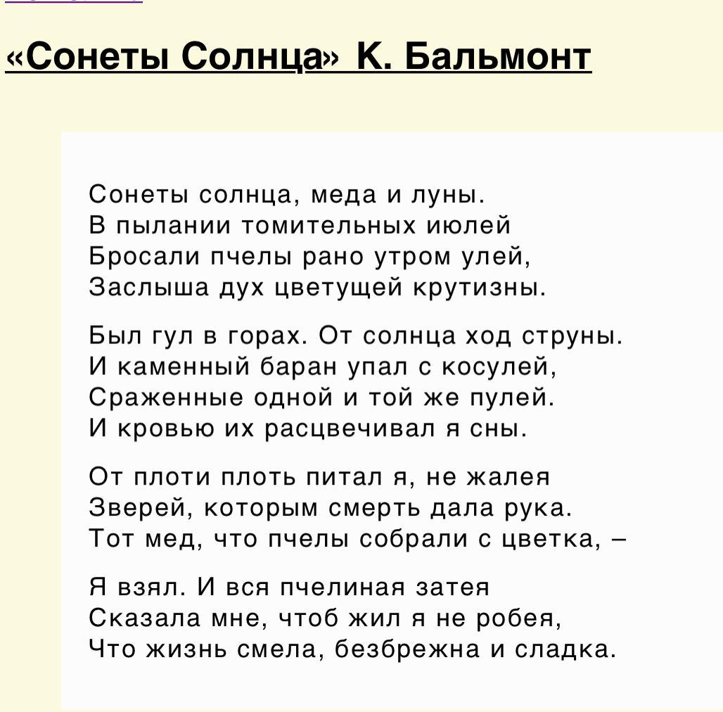 Именно это явление мы можем наблюдать, исследуя творческий путь Константина Дмитриевича Бальмонта. На примере произведения «Сонеты Солнца, меда и Луны» легко понять, что все окружающие события, вещи и люди оставляют неизгладимый след в душе поэта, который не может не отразиться в его работах.