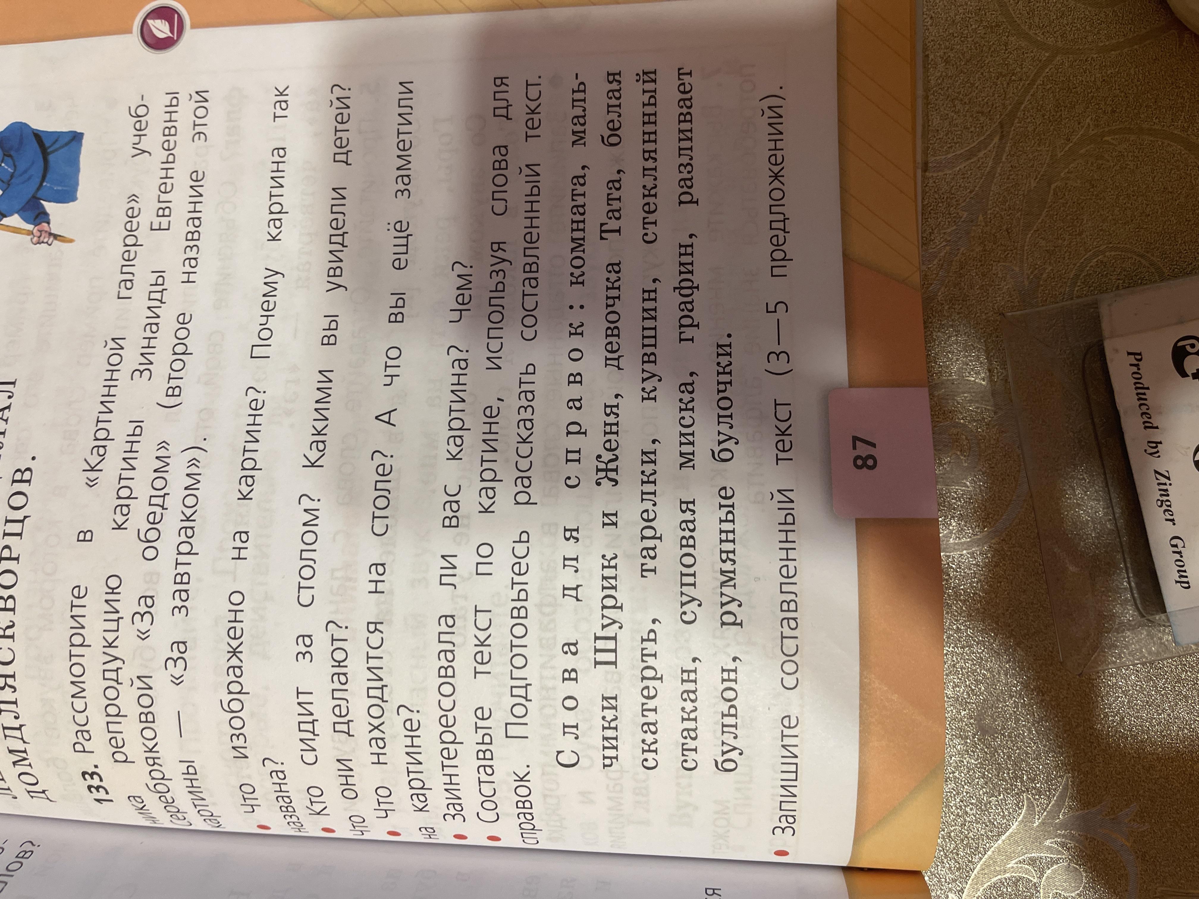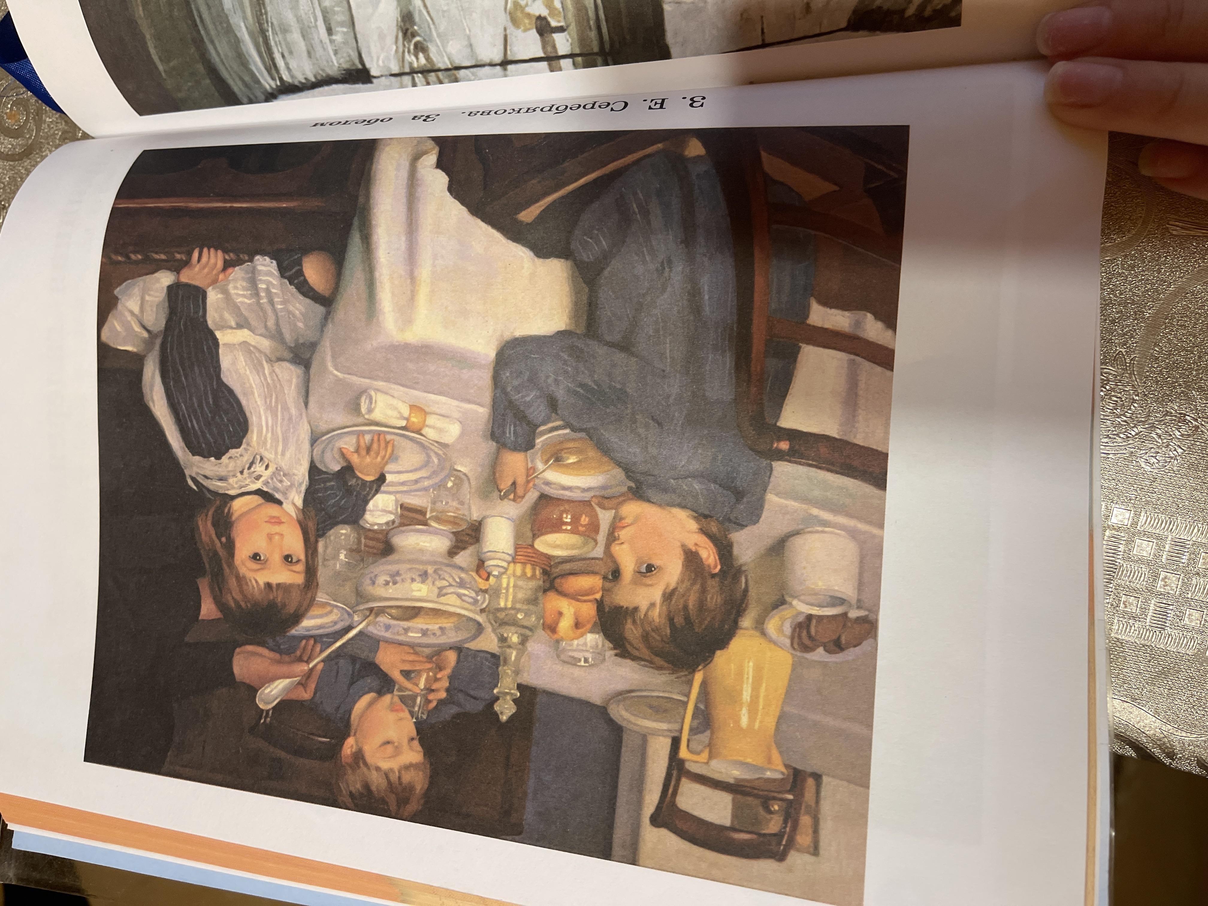 Картина художницы знакомит нас с одним днём из жизни семьи.Мальчики Женя и Шурик сидят за столом,один ест суп,а второй пьет воду,ожидая,пока мама разливает бульон из большой суповой миски.Девочка Тата немного отвлеклась,она смотрит в сторону,вероятно кто-то ещё вошёл в комнату.