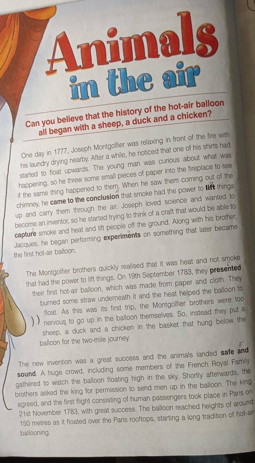 Братья Монгольфье быстро поняли, что поднимать предметы может тепло, а не дым. 19 сентября 1783 года они представили свой первый воздушный шар, сделанный из бумаги и ткани. Они сожгли под ним немного соломы, и тепло помогло воздушному шару подняться в воздух. Поскольку это был его первый полет, братья Монгольфье были слишком нервными, чтобы подняться на воздушном шаре самостоятельно. Поэтому вместо этого они положили овцу, утку и курицу в корзину, которая висела под воздушным шаром для двухмильного путешествия.