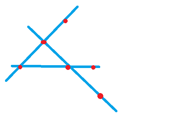 начерти 3 прямые так чтобы на каждой прямой было отмечено по 3 точки а всего было отмечено 6 точек