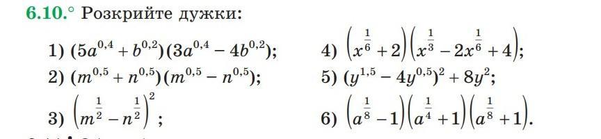 (5a^{0,4}+b^{0,2})(3a^{0,4}-4b^{0,2})=15a^{0,8}-17a^{0,4}\, b^{0,2}-4b^{0,4}\\\\\\(m^{0,5}+n^{0,5})(m^{0,5}-n^{0,5})=m-\\\\\Big(m^{\frac{1}{2}}-n^{\frac{1}{2}}\Big)^2=m-2m^{\frac{1}{2}}\, n^{\frac{1}{2}}+n\\\\\Big(x^{\frac{1}{6}}+2\Big)\Big(x^{\frac{1}{3}}-2x^{\frac{1}{6}}+4\Big)=x^{\frac{1}{2}}+8\\\\\Big(y^{1,5}-4y^{0,5}\Big)^2+8y^2=y^3-8y^2+16y+8y^2=y^3+16y