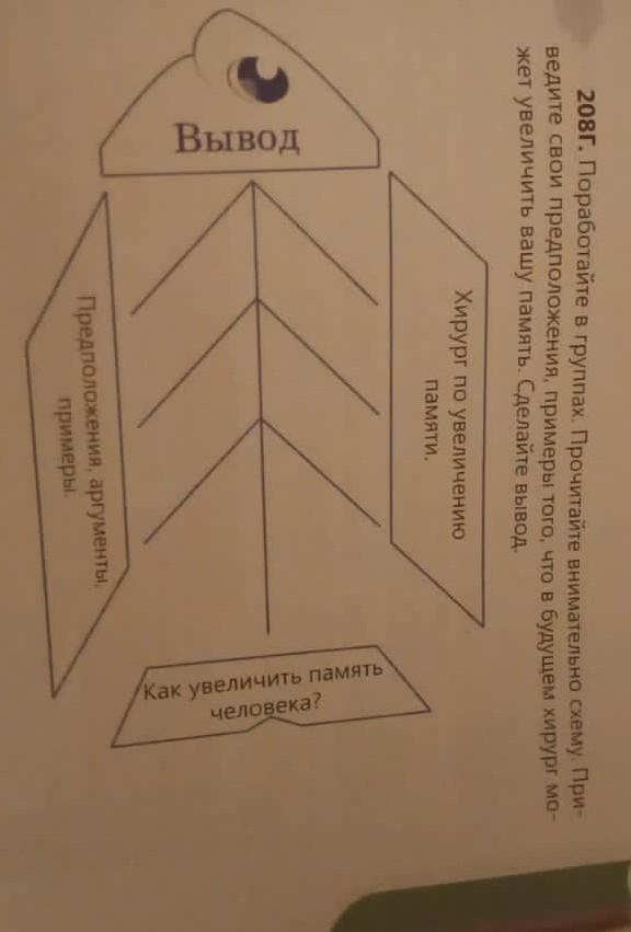 208г. Поработайте в группах. Прочитайте внимательно схему. При- ведите свои предположения, примеры того, что в будущем хирург мо- жет увеличить вашу память. Сделайте вывод. Хирург по увеличению памяти. Вывод Как увеличить память человека? Предположения, аргументы, примеры.