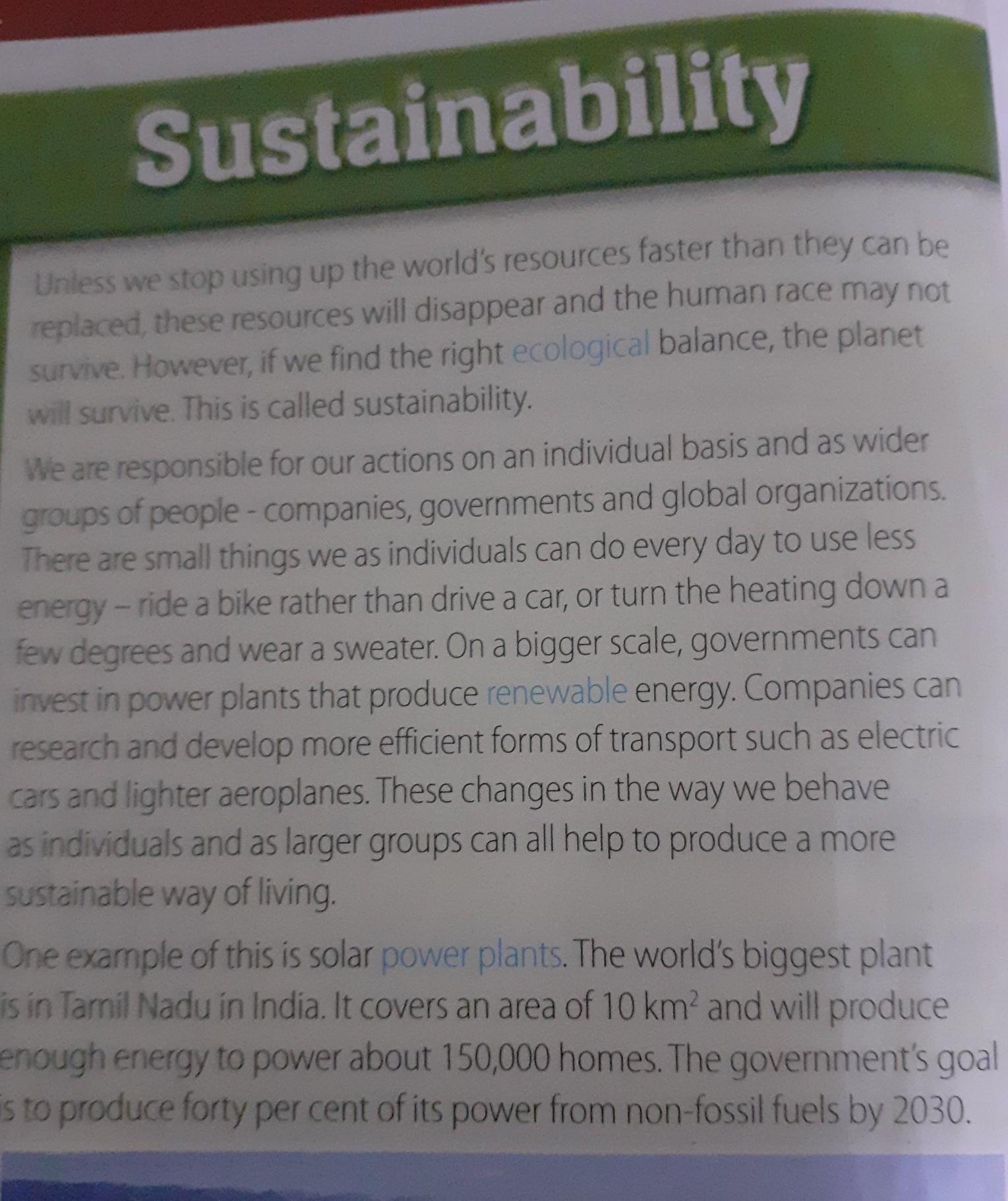 1.26 2 Read and listen to the text. Write true or false. Correct the false statements. 1 It is impossible to find the right ecological balance. Fol se 2 Individuals can help create a more sustainable way of living. 3 The Indian government plans to produce most of its energy from non-fossil fuels by 2030. 4 After 2040, people in the UK won't be able to buy new petrol cars. 5 Petrol and diesel cars cause half the air pollution 6 It is possible for our children to have a quality life.