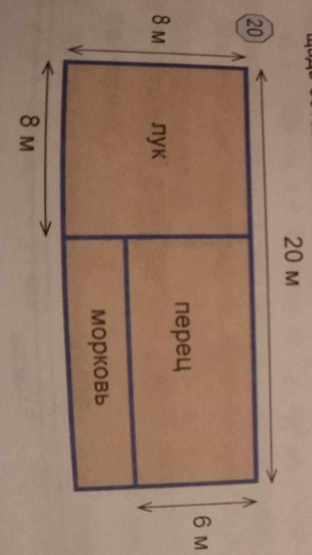 Дальше перец так как сторона участка равна 20 см а сторона лука 8 см то сторона перца равна:
