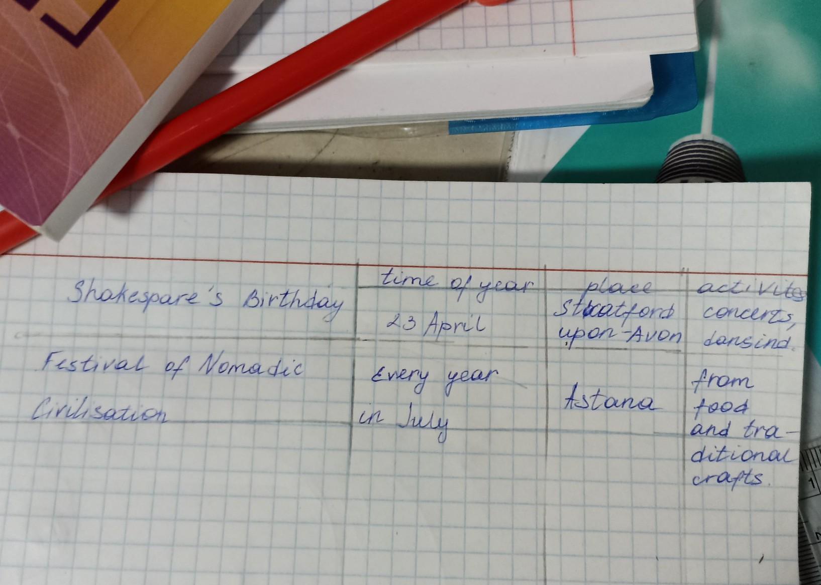8.3.1.1 time of year 3 8.4.11 Copy and complete the table in your notebook Then, use the completed table to present the two festivals to the class. place activities Shakespeare's Birthday Festival of Nomadic Civilisation Shakespeare's Birthday is on .... It takes place