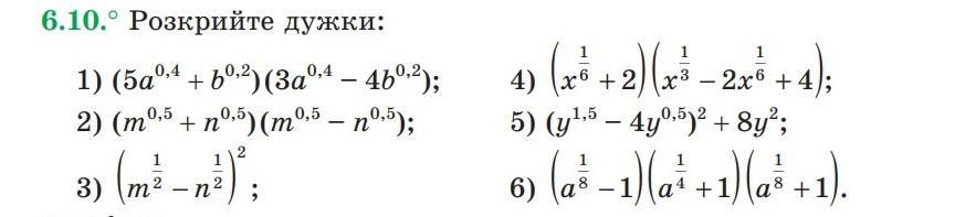 (5a^{0,4}+b^{0,2})(3a^{0,4}-4b^{0,2})=15a^{0,8}-17a^{0,4}\, b^{0,2}-4b^{0,4}\\\\\\(m^{0,5}+n^{0,5})(m^{0,5}-n^{0,5})=m-\\\\\Big(m^{\frac{1}{2}}-n^{\frac{1}{2}}\Big)^2=m-2m^{\frac{1}{2}}\, n^{\frac{1}{2}}+n\\\\\Big(x^{\frac{1}{6}}+2\Big)\Big(x^{\frac{1}{3}}-2x^{\frac{1}{6}}+4\Big)=x^{\frac{1}{2}}+8\\\\\Big(y^{1,5}-4y^{0,5}\Big)^2+8y^2=y^3-8y^2+16y+8y^2=y^3+16y