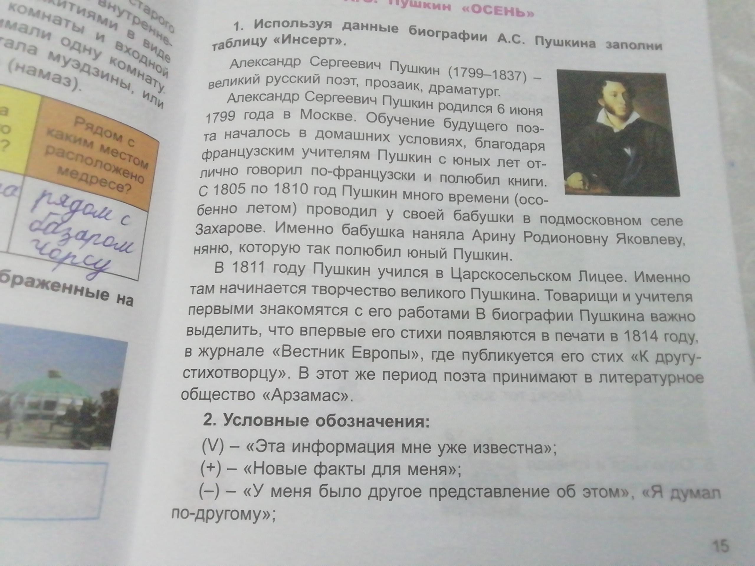 1. Используя данные биографии А.С. Пушкина заполни таблицу "Инсерт".