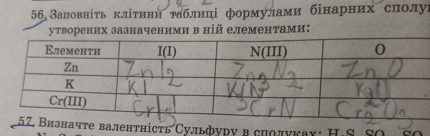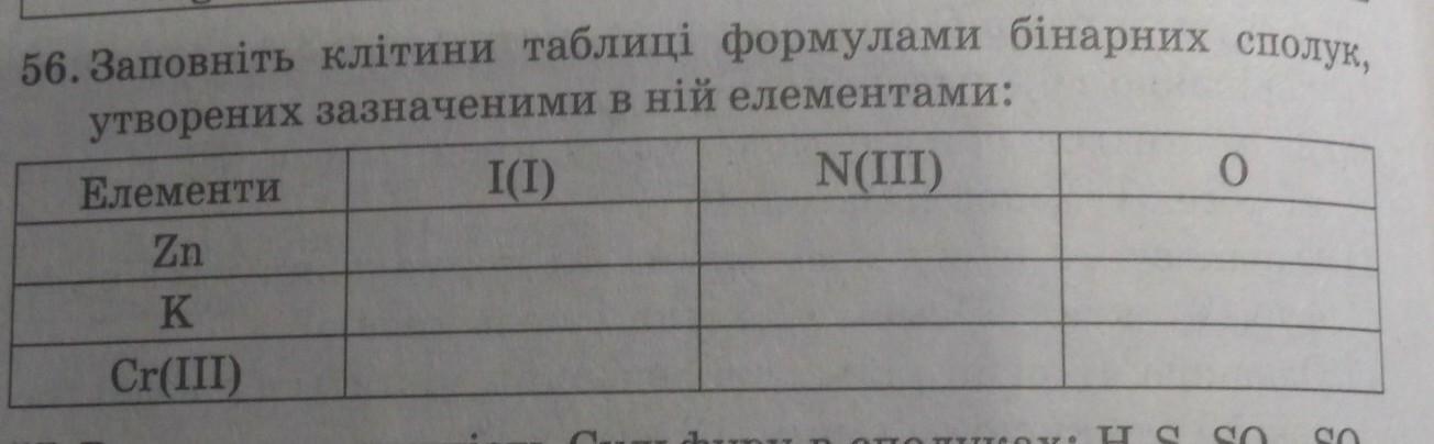 56. Заповніть клітини таблиці формулами бінарних сполук. утворених зазначеними в ній елементами: