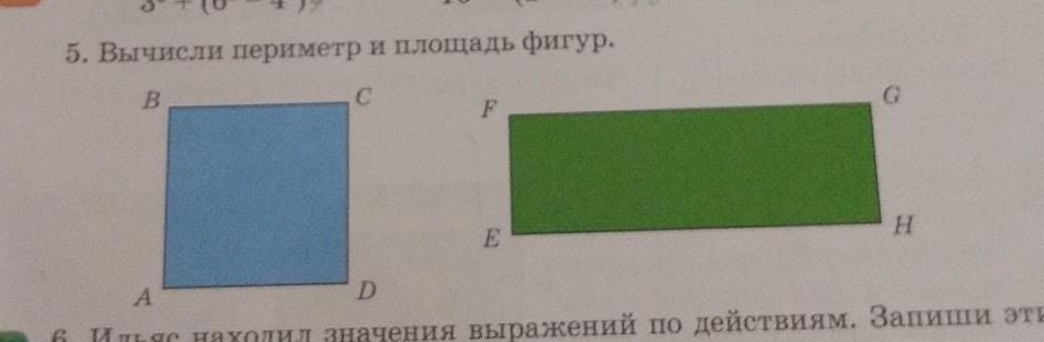 Вычисли периметр и площадь фигуры Квадрат-все стороны по 3см прямо угольник-EH и FG оба 6см FE и GH оба 2 см
