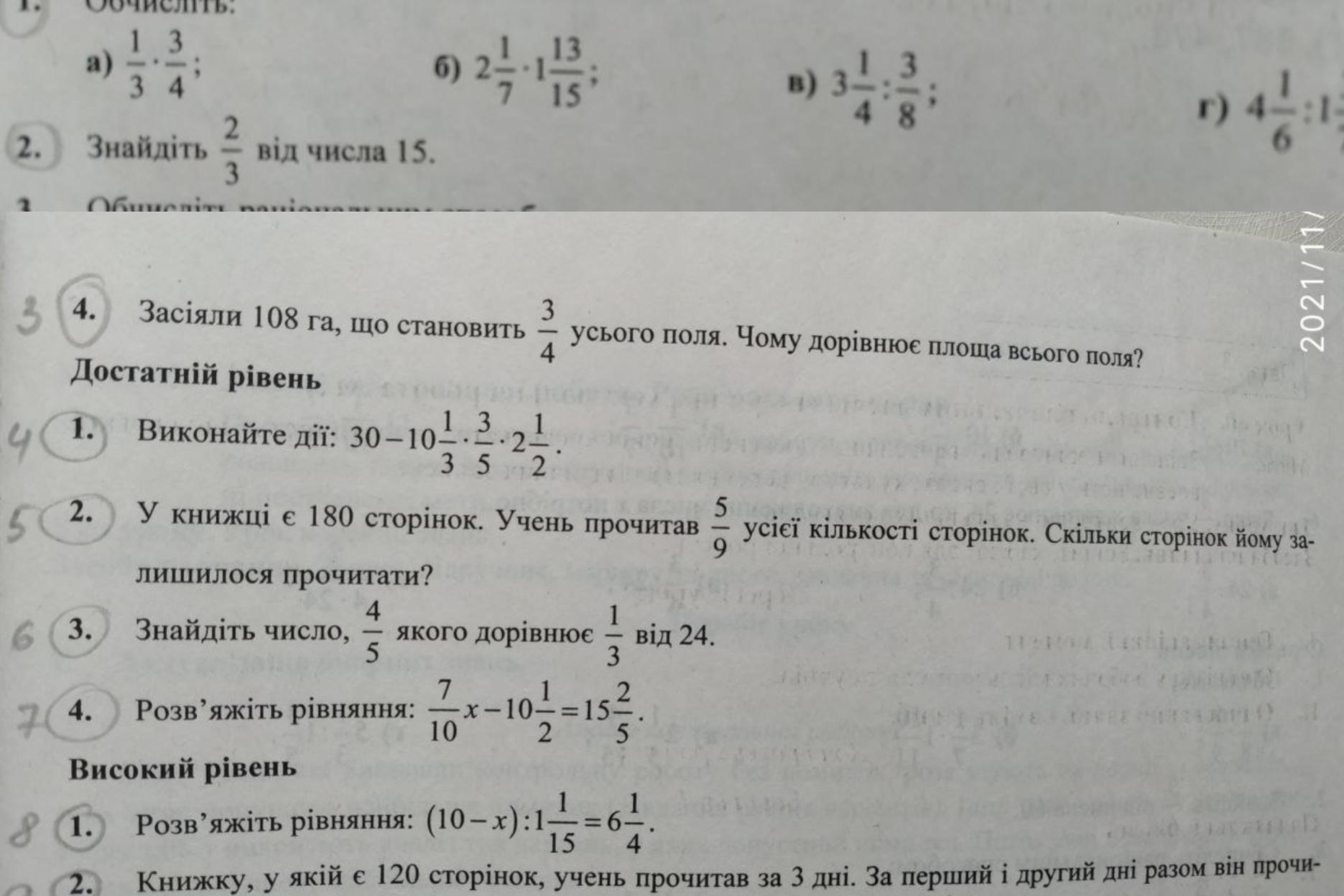 Продовження задачі: прочитав 7/12 усіх сторінок а 2 і 3 день — 2/3 усіх сторінок. Скільки сторінок прочитав учень