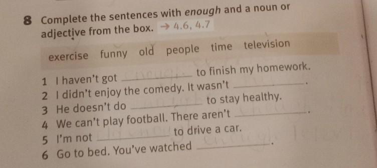 8 Complete the sentences with enough and a noun or adjective from the box. 4.6, 4.7 exercise funny old people time people time television 1 I haven't got - to finish my homework. 2 I didn't enjoy the comedy. It wasn't 3 He doesn't do to stay healthy. 4 We can't play football. There aren't 5 I'm not to drive a car. 6 Go to bed. You've watched