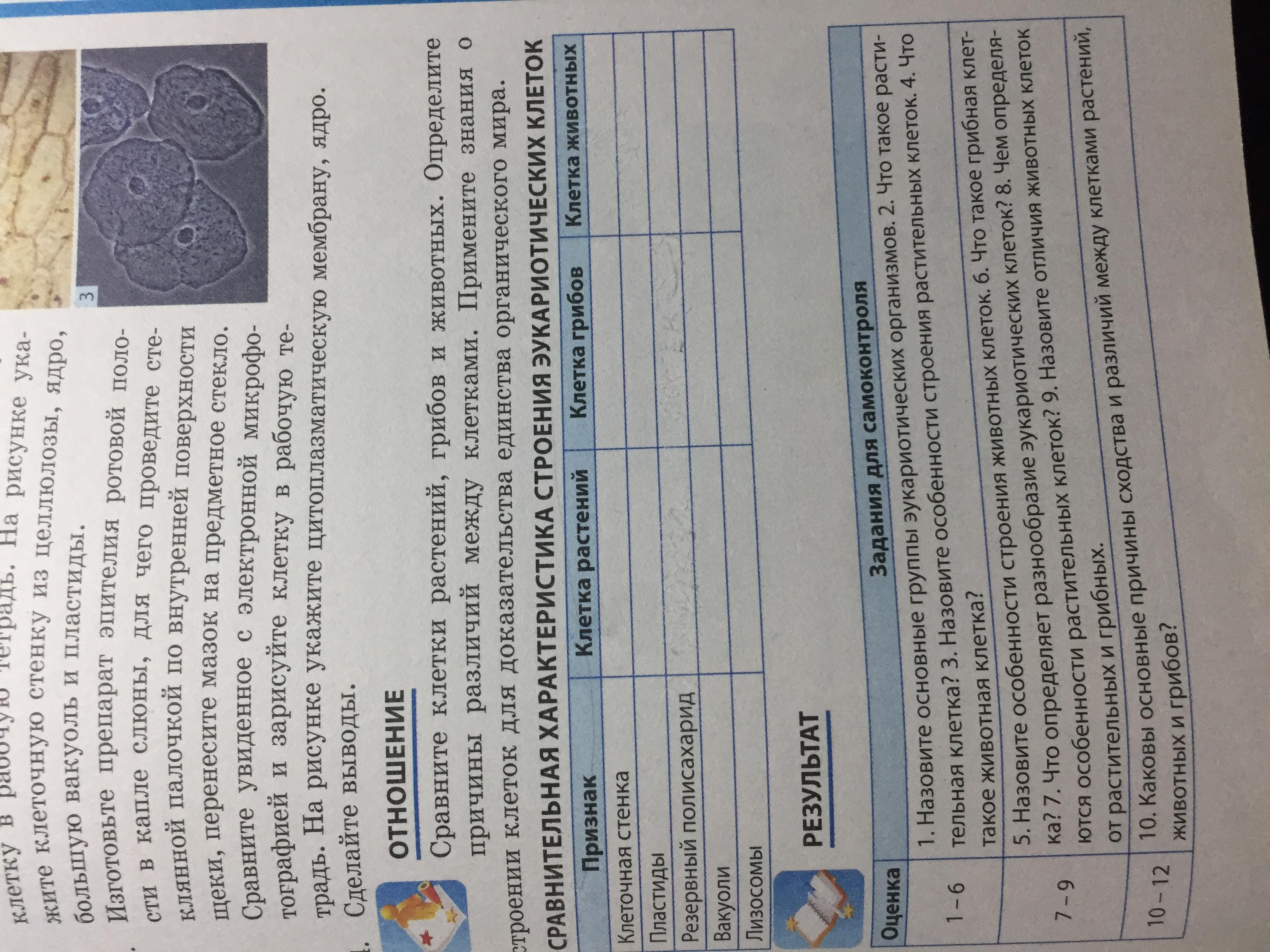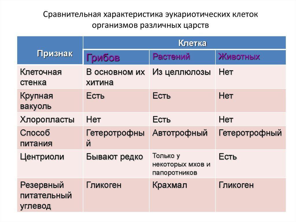 Таблица, сравнительная характеристика строения эукариотических клеток.