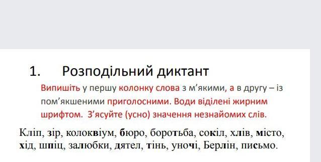 Слова з пом'якшеними приголосними: бюро, Берлін, дятел, місто, колоквіум, зір, сокіл, хліб, хід, шпіц, уночі, залюбки,