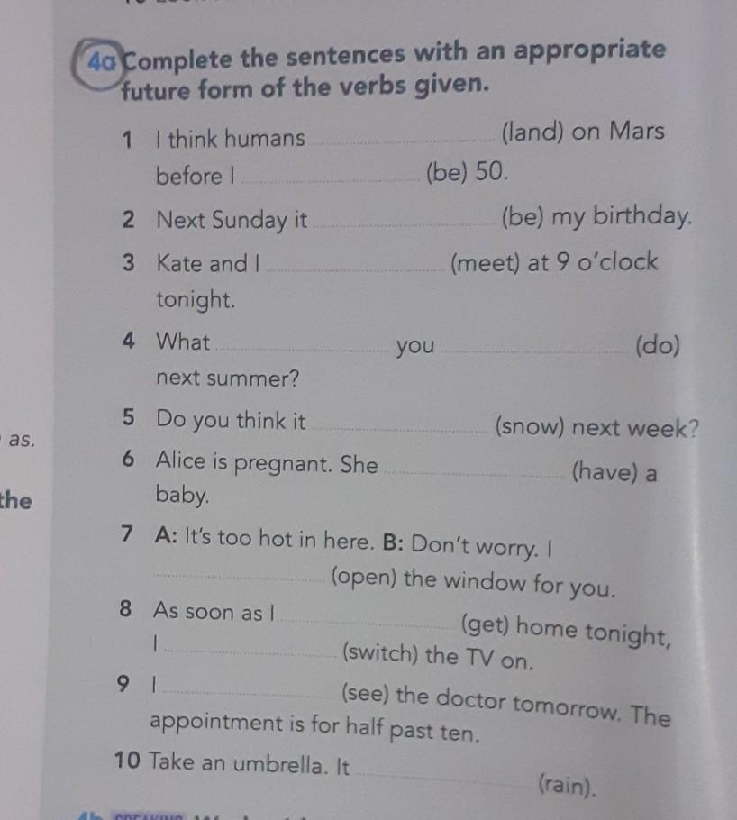 4a Complete the sentences with an appropriate future form of the verbs given. 1 I think humans (land) on Mars before 1. (be) 50. 2 Next Sunday it (be) my birthday. 3 Kate and I (meet) at 9 o'clock tonight. 4. What you (do) next summer? 5 Do you think it (snow) next week? 6 Alice is pregnant. She (have) a baby. 7 A: It's too hot in here. B: Don't worry. I (open) the window for you. 8 As soon as I (get) home tonight, (switch) the TV on. 91 (see) the doctor tomorrow. The appointment is for half past ten. 10 Take an umbrella. It (rain).