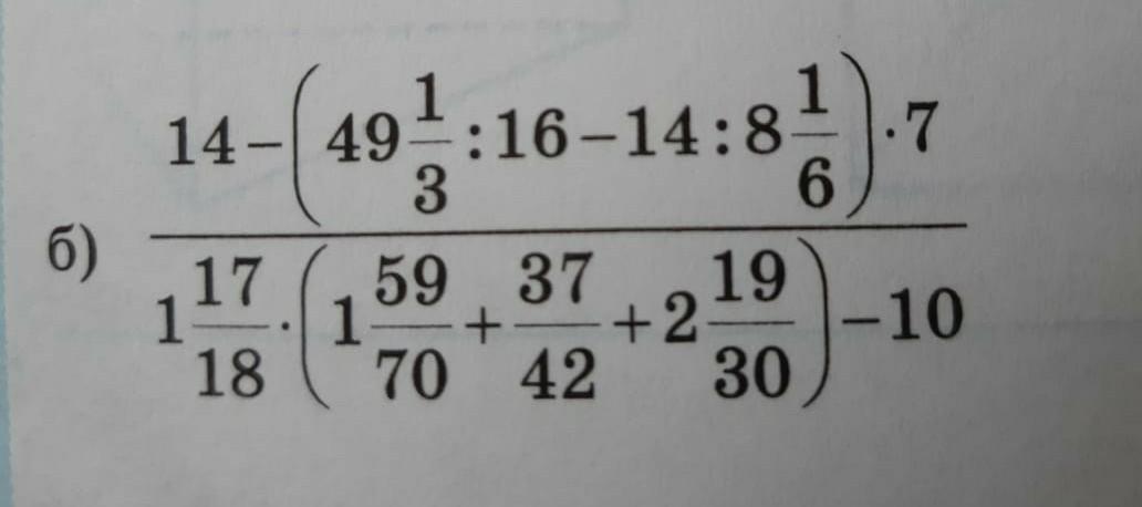 (14- ( 49 1/3 ; 16 - 14 : 8 1/6) *7))/1 17/18 * ( 1 59/70 +37/42+2 19/30)- 10 = 10 3/5