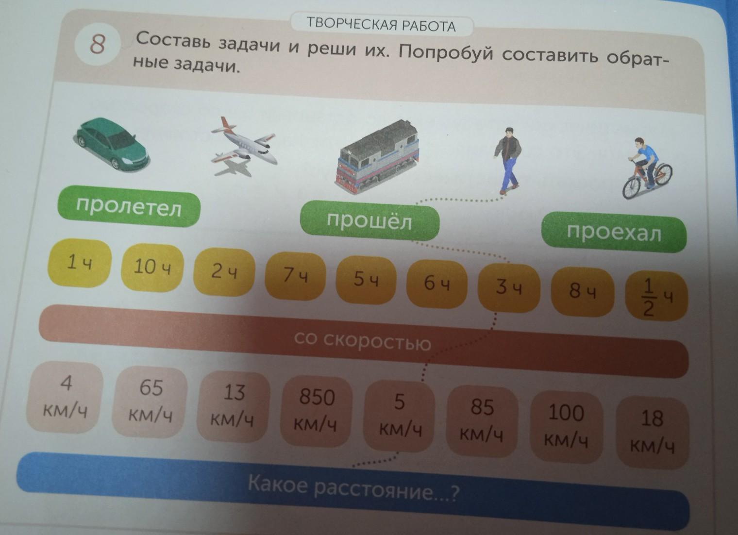 8 Составь задачи и решни их. Попробуй составить обрат- ные задача пролетел прошел проехал 10 4 24 3- S со скоросто 4 65 13 км/ч 850 км/ч 85 100 км/ч 5 KM/ 18 Какое расстояние ?помогите пожалуйста решить задачу срочно нужно сделать