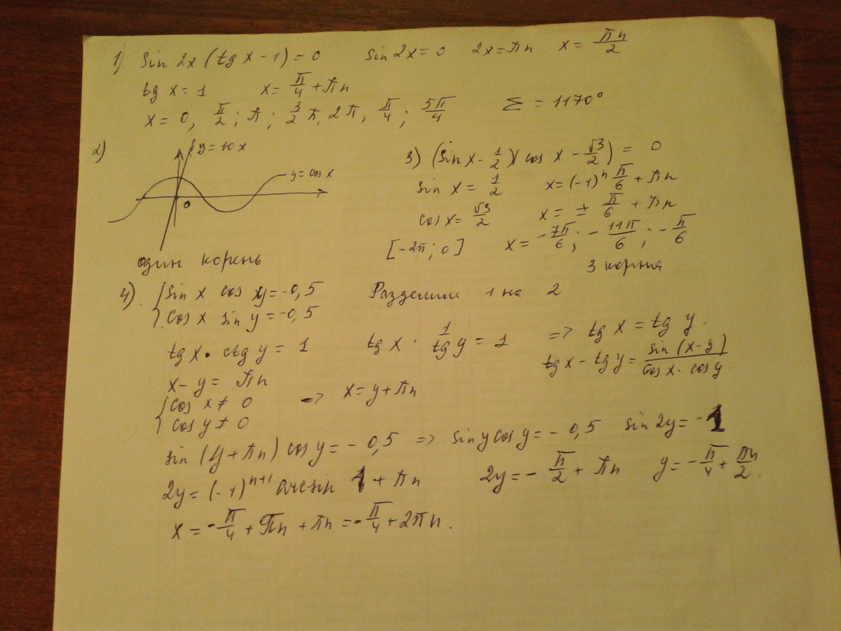1)Найдите сумму корней уравнения sin(2x)(tgx-1)=0,принадлежащих промежутку [0;2pi].Ответ запишите в градусах.