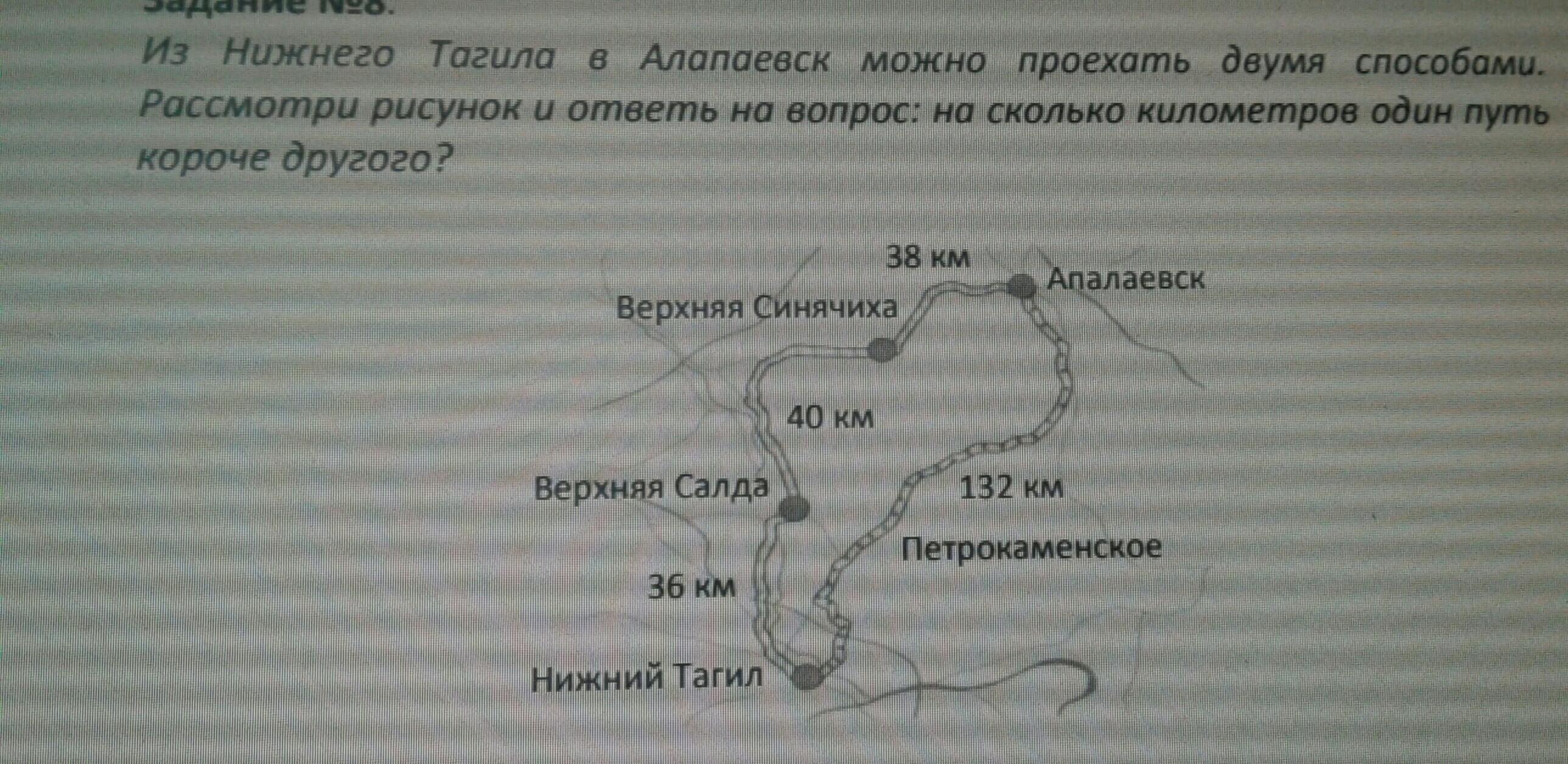 Из нижнего Тагила в Алапаевск можно проехать двумя способами. Рассмотрим рисунок и ответь на вопрос: на сколько километров один путь короче другого?