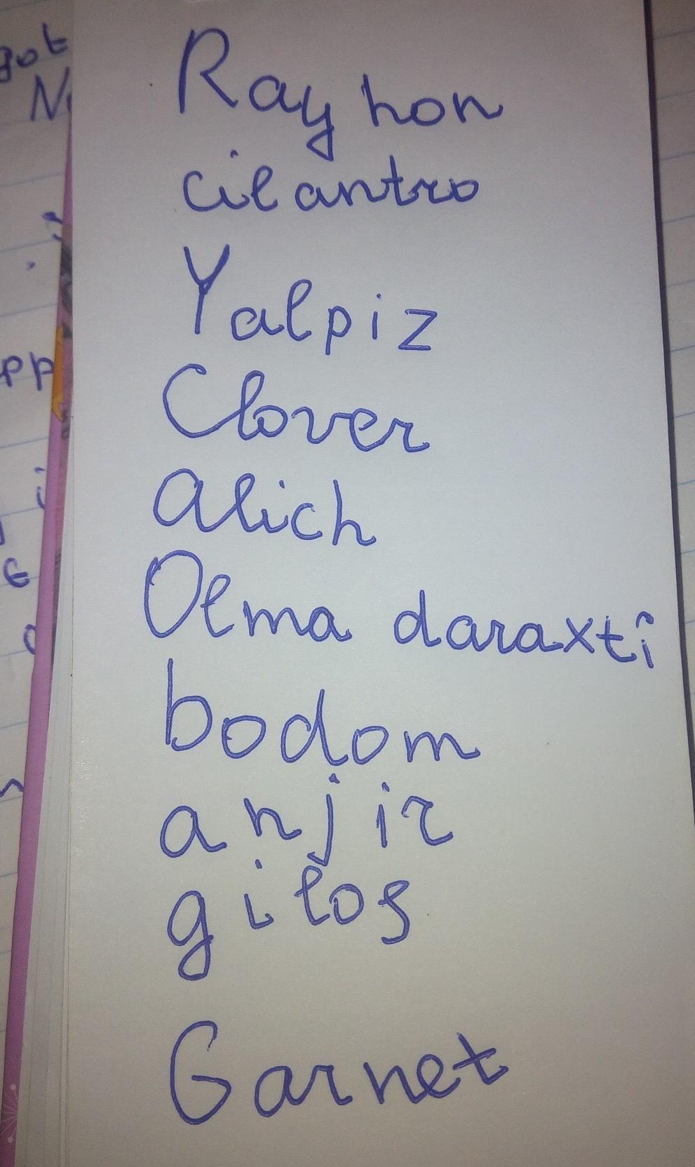 Ответ: boychechak, atirgul,moychechak, anor daraxti, tut daraxti, olma daraxti, gilos.